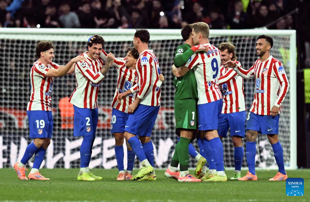 Players of Atletico de Madrid celebrate after the UEFA Champions League football match between Atletico de Madrid and Inter Milan in Madrid, Spain, Nov. 26, 2025. (Xinhua/Cheng Min)