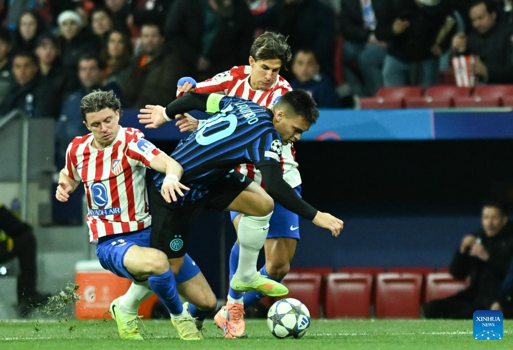 Lautaro Martinez (R) of Inter Milan competes during the UEFA Champions League football match between Atletico de Madrid and Inter Milan in Madrid, Spain, Nov. 26, 2025. (Xinhua/Cheng Min)