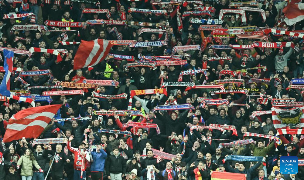 Supporters of Atletico de Madrid cheer during the UEFA Champions League football match between Atletico de Madrid and Inter Milan in Madrid, Spain, Nov. 26, 2025. (Xinhua/Cheng Min)