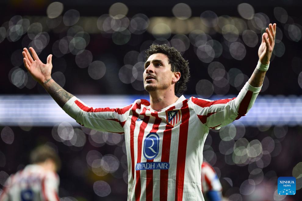 Jose Maria Gimenez of Atletico de Madrid celebrates a goal during the UEFA Champions League football match between Atletico de Madrid and Inter Milan in Madrid, Spain, Nov. 26, 2025. (Xinhua/Cheng Min)