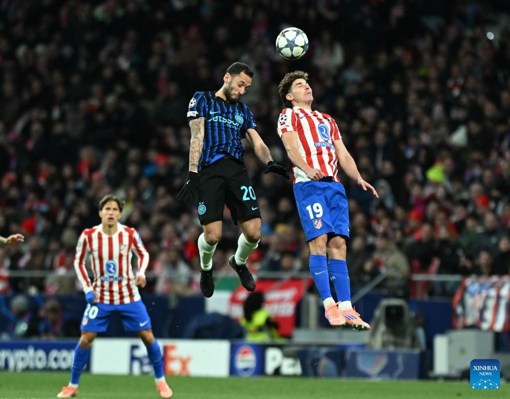 Hakan Calhanoglu (top L) of Inter Milan vies for a header during the UEFA Champions League football match between Atletico de Madrid and Inter Milan in Madrid, Spain, Nov. 26, 2025. (Xinhua/Cheng Min)
