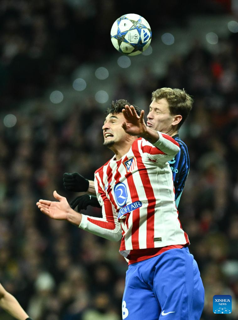 Marc Pubill (L) of Atletico de Madrid vies for a header during the UEFA Champions League football match between Atletico de Madrid and Inter Milan in Madrid, Spain, Nov. 26, 2025. (Xinhua/Cheng Min)