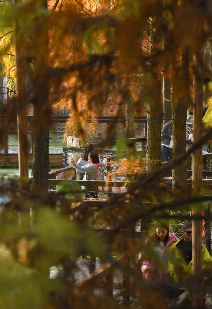 HANGZHOU, Nov. 28 (Xinhua) -- Qingshan Lake, an artificial lake in Lin'an District of Hangzhou City, east China's Zhejiang Province, is noted for its waterlogged forest. The beautiful scenery in the Qingshan Lake scenic spot attracts lots of tourists during the season.
