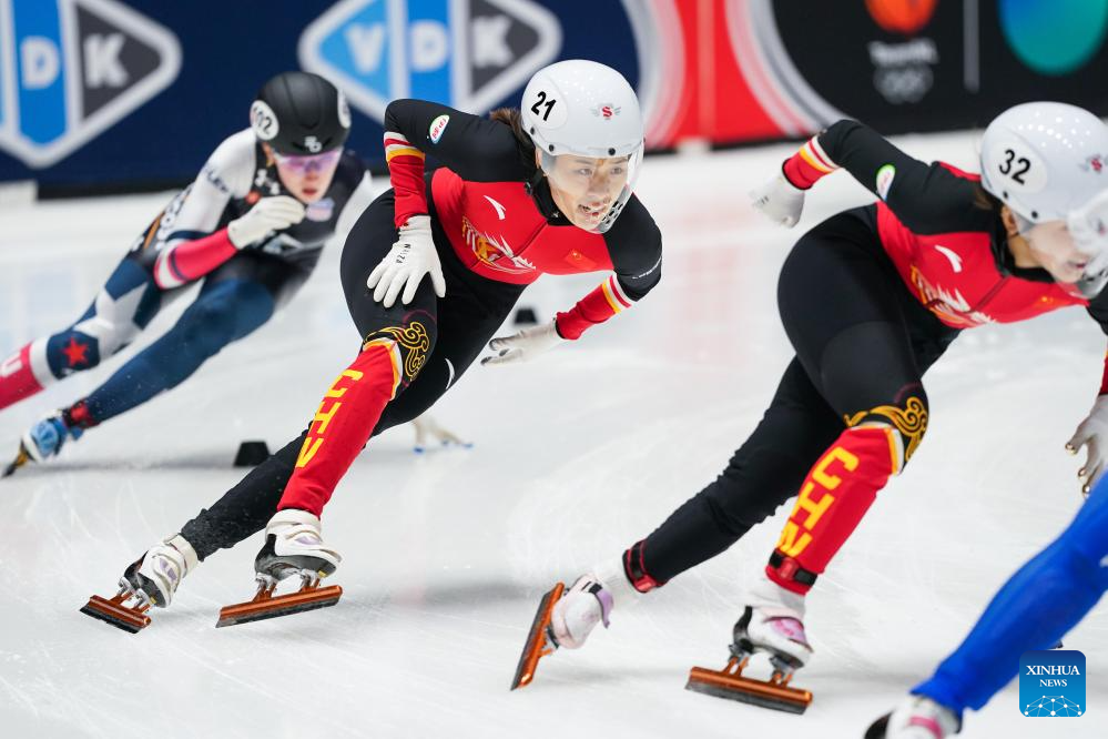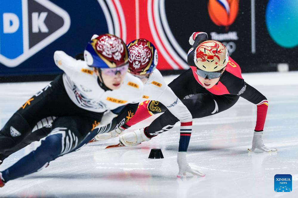 Zhang Chutong (C) of China competes during the women's 1500m quarterfinals at the ISU Short Track World Tour #4 speed skating event in Dordrecht, the Netherlands, Nov. 28, 2025. (Xinhua/Peng Ziyang)