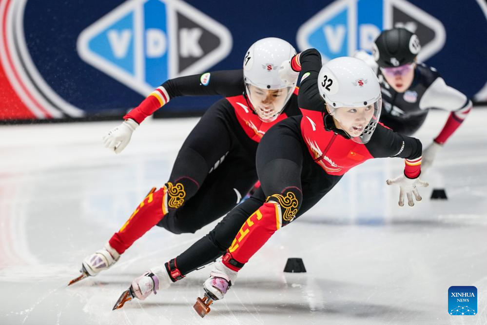 Gong Li (R) of China competes during the women's 1500m quarterfinals at the ISU Short Track World Tour #4 speed skating event in Dordrecht, the Netherlands, Nov. 28, 2025. (Xinhua/Peng Ziyang)