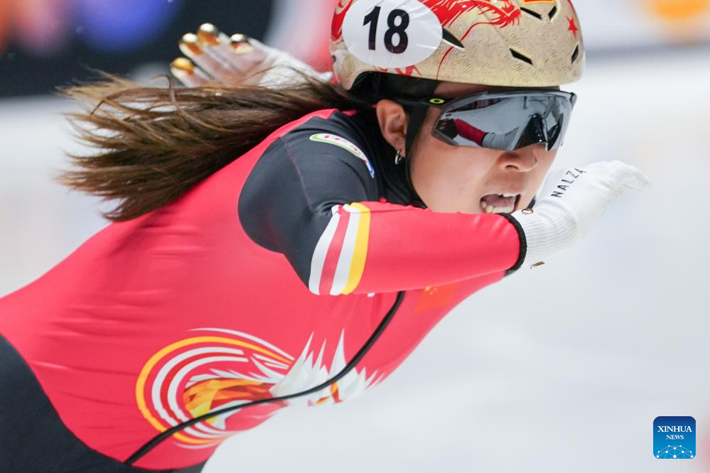 Gong Li of China competes during the women's 1500m quarterfinals at the ISU Short Track World Tour #4 speed skating event in Dordrecht, the Netherlands, Nov. 28, 2025. (Xinhua/Peng Ziyang)