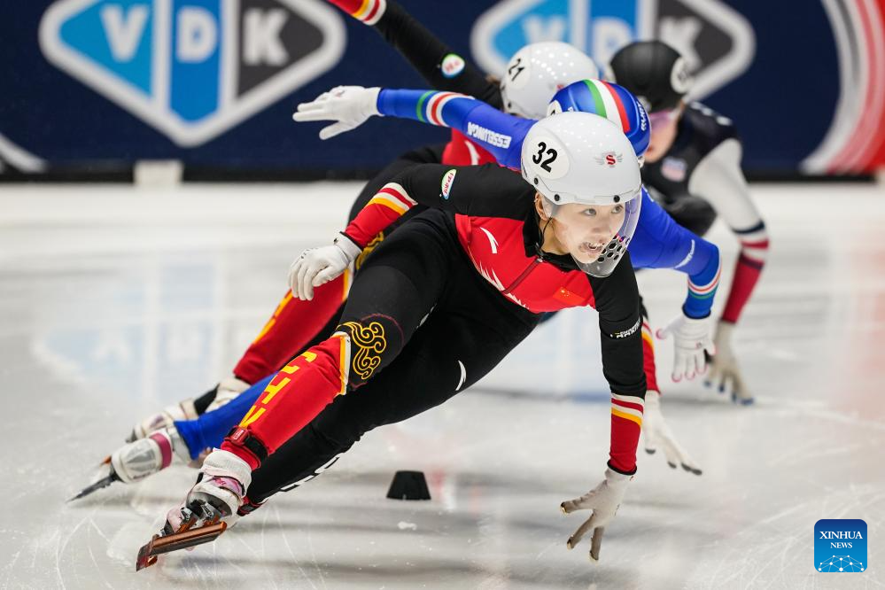Yang Jingru (front) of China competes during the women's 1500m quarterfinals at the ISU Short Track World Tour #4 speed skating event in Dordrecht, the Netherlands, Nov. 28, 2025. (Xinhua/Peng Ziyang)
