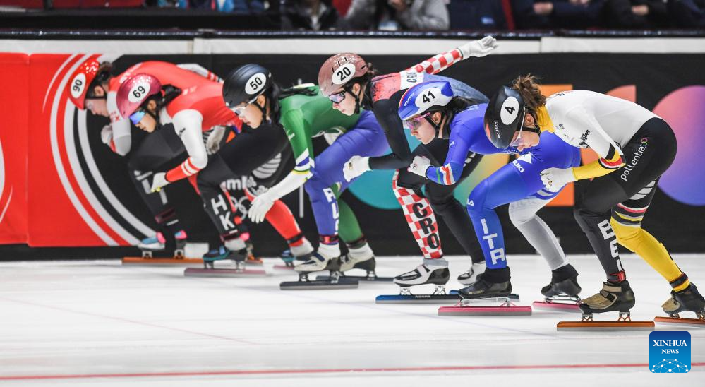 Skaters start during the women's 1500m quarterfinals at the ISU Short Track World Tour #4 speed skating event in Dordrecht, the Netherlands, Nov. 28, 2025. (Xinhua/Peng Ziyang)
