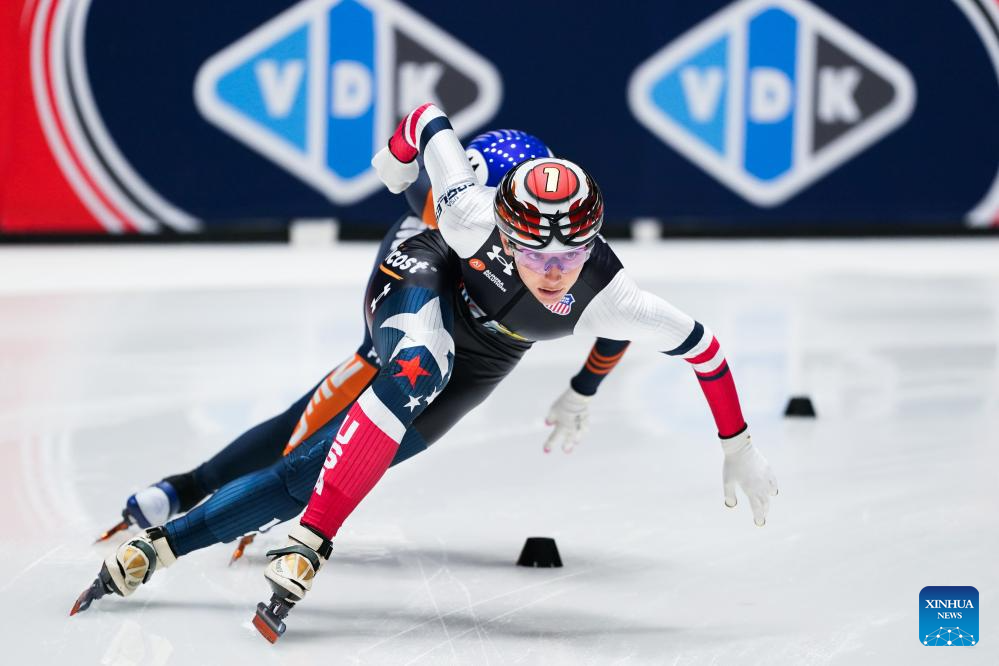 Kristen Santos-Griswold of the United States competes during the women's 1500m quarterfinals at the ISU Short Track World Tour #4 speed skating event in Dordrecht, the Netherlands, Nov. 28, 2025. (Xinhua/Peng Ziyang)