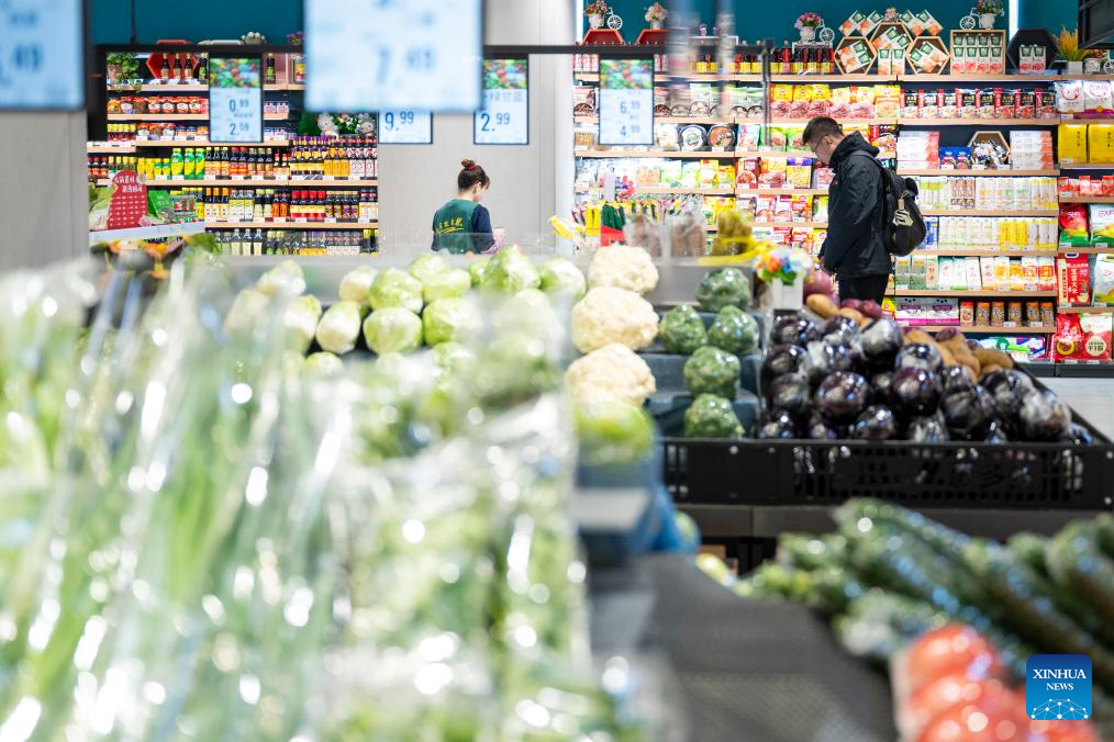 A resident shops at a supermarket in Wenhua community in Xiong'an New Area, north China's Hebei Province, Nov. 25, 2025. The Xiong'an New Area, designed to relieve Beijing of its non-essential functions, has been leveraging smart and considerate public services to facilitate daily life of relocated residents.