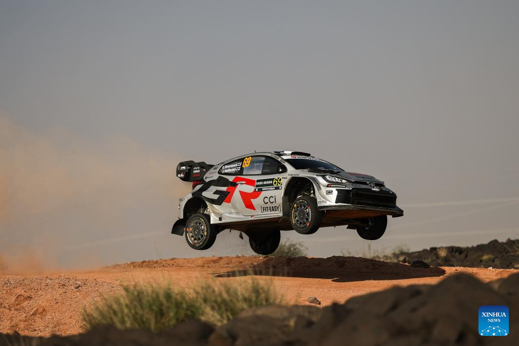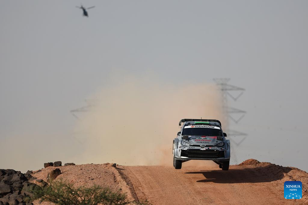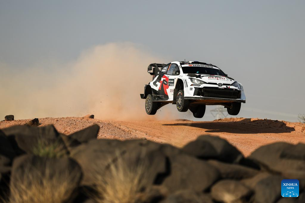 Toyota Gazoo Racing World Rally Team's British driver Elfyn Evans and British co-driver Scott Martin compete during the last day of the FIA World Rally Championship (WRC) Saudi Arabia in Jeddah, Saudi Arabia, Nov. 29, 2025. (Photo by Qian Jun/Xinhua)