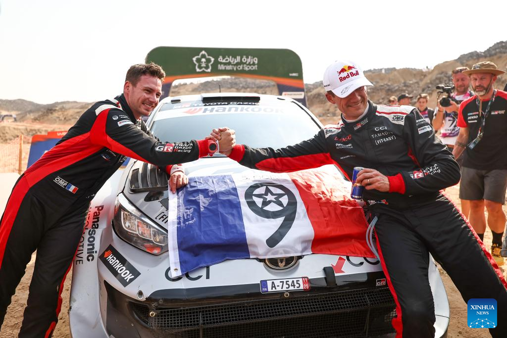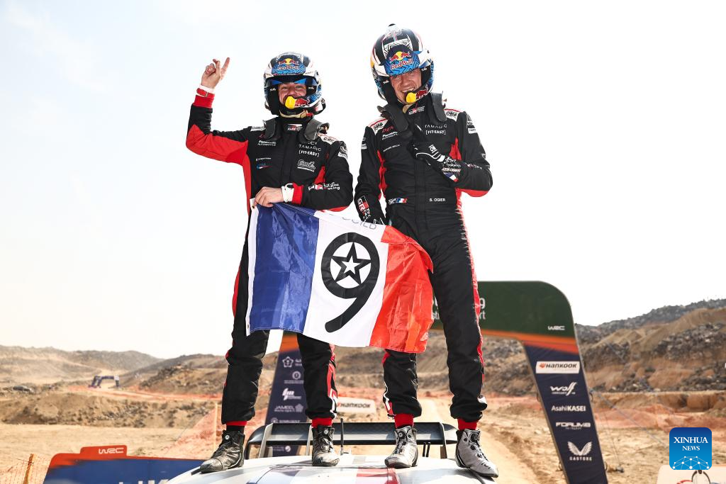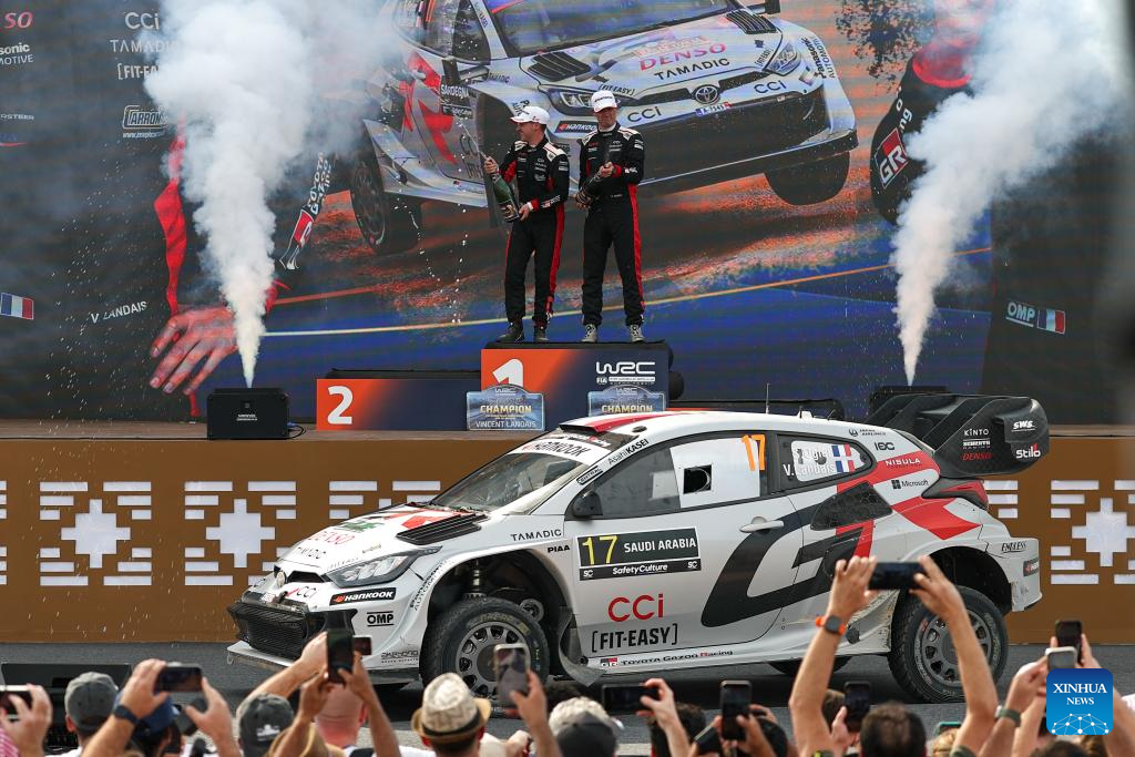 Toyota Gazoo Racing World Rally Team's French driver Sebastien Ogier (R) and French co-driver Vincent Landais celebrate during the last day of the FIA World Rally Championship (WRC) Saudi Arabia in Jeddah, Saudi Arabia, Nov. 29, 2025. (Photo by Qian Jun/Xinhua)