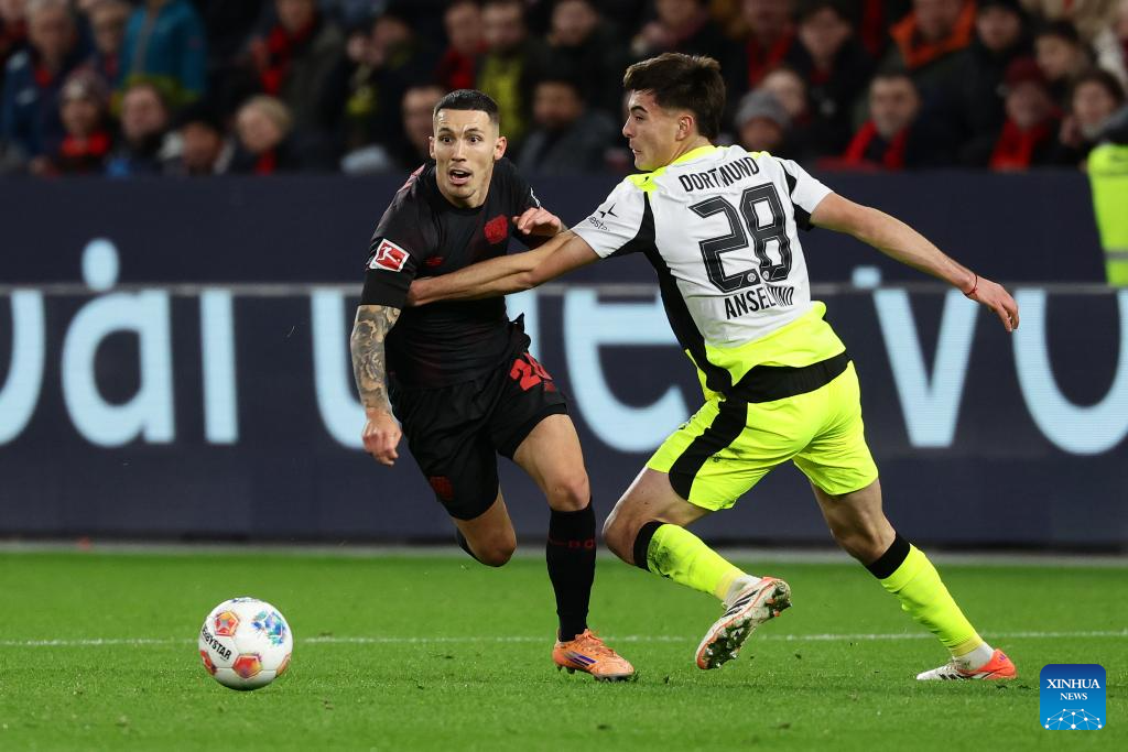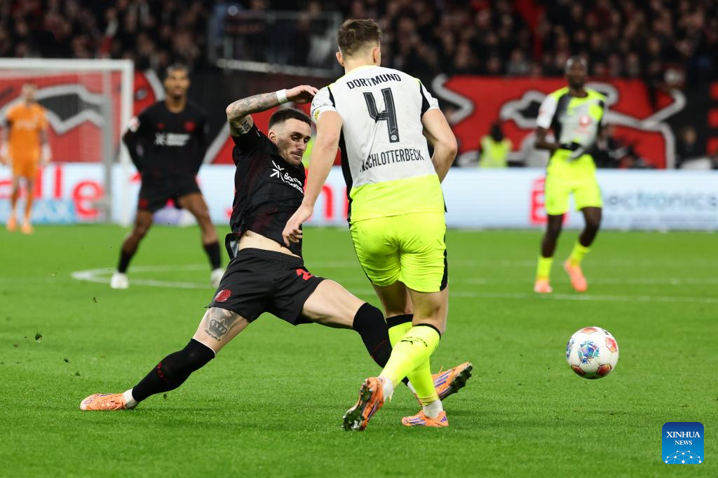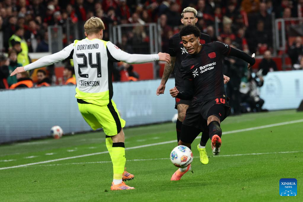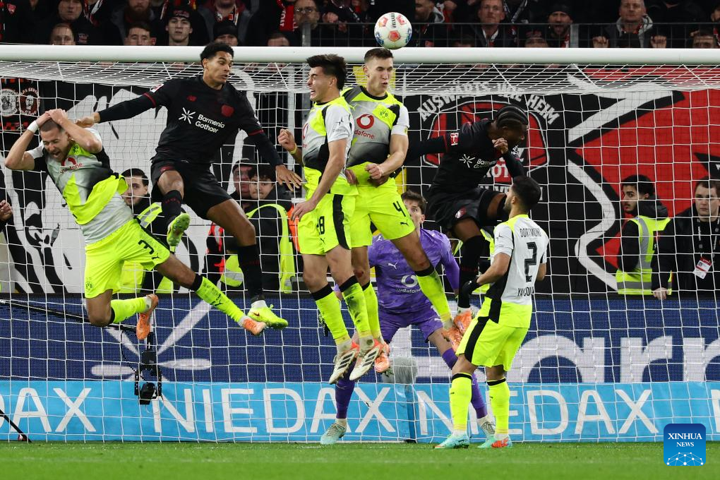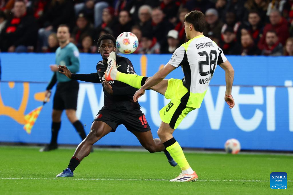 Players vie for the ball during the German first division of Bundesliga football match between Bayer 04 Leverkusen and Borussia Dortmund in Leverkusen, Germany, Nov. 29. 2025. (Photo by Joachim Bywaletz/Xinhua)