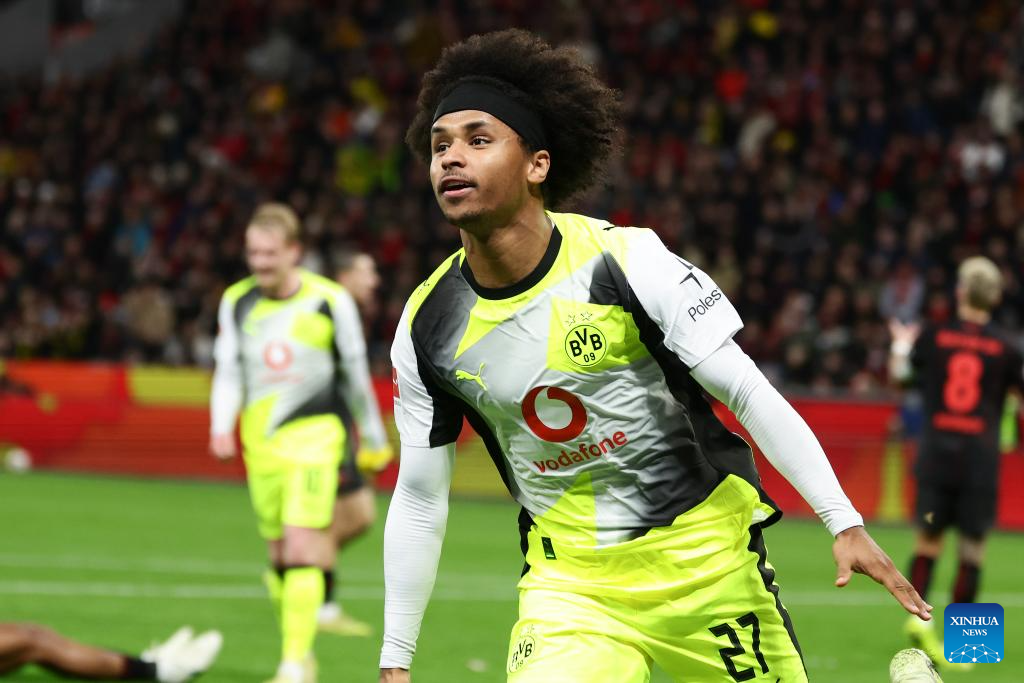 Karim Adeyemi of Borussia Dortmund celebrates scoring during the German first division of Bundesliga football match between Bayer 04 Leverkusen and Borussia Dortmund in Leverkusen, Germany, Nov. 29. 2025. (Photo by Joachim Bywaletz/Xinhua)
