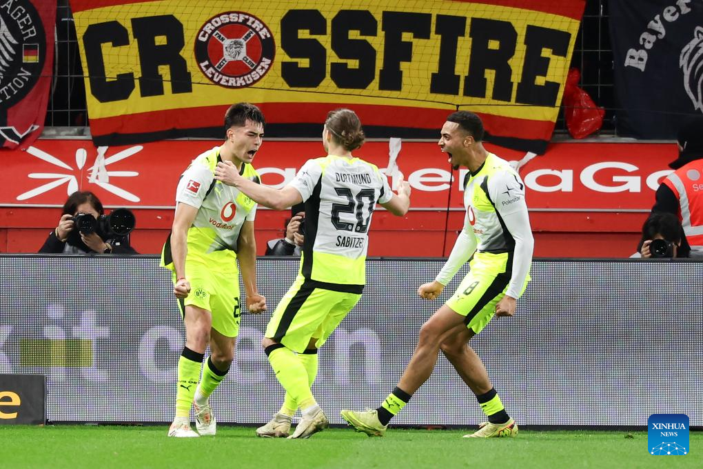 Players of Borussia Dortmund celebrate scoring during the German first division of Bundesliga football match between Bayer 04 Leverkusen and Borussia Dortmund in Leverkusen, Germany, Nov. 29. 2025. (Photo by Joachim Bywaletz/Xinhua)