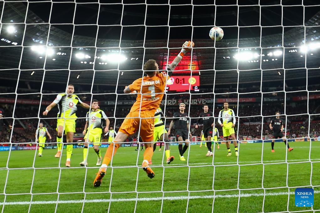 Mark Flekken (front), goalkeeper of Bayer 04 Leverkusen, makes a save during the German first division of Bundesliga football match between Bayer 04 Leverkusen and Borussia Dortmund in Leverkusen, Germany, Nov. 29. 2025. (Photo by Joachim Bywaletz/Xinhua)
