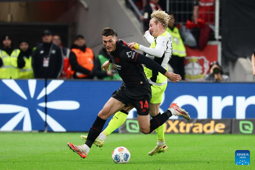 Aleix Garcia (L) of Bayer 04 Leverkusen vies with Nico Schlotterbeck of Borussia Dortmund during the German first division of Bundesliga football match between Bayer 04 Leverkusen and Borussia Dortmund in Leverkusen, Germany, Nov. 29. 2025. (Photo by Joachim Bywaletz/Xinhua)
