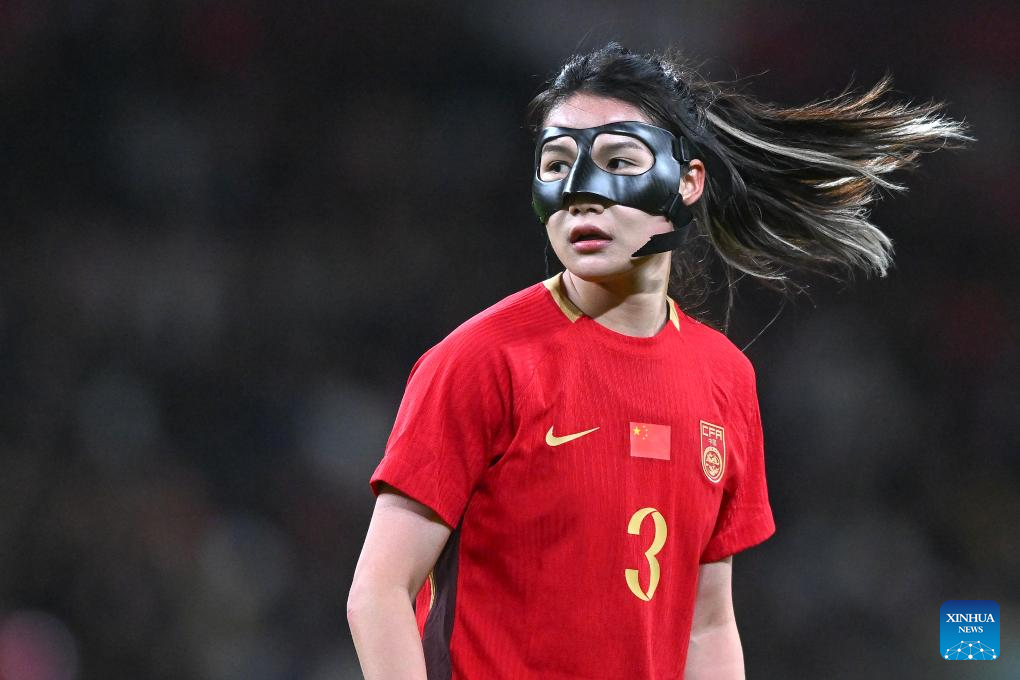 China's Dou Jiaxing reacts during an international women's football friendly match between China and England at Wembley Stadium in London, Britain, Nov. 29, 2025. (Photo by Vince Mignott/Xinhua)