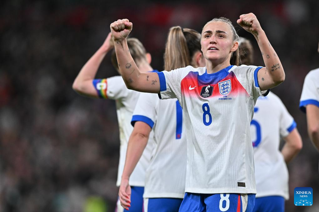 England's Georgia Stanway celebrates scoring during an international women's football friendly match between China and England at Wembley Stadium in London, Britain, Nov. 29, 2025. (Photo by Vince Mignott/Xinhua)
