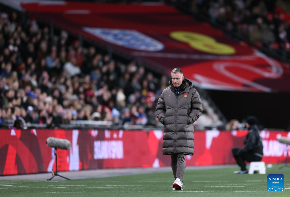 China's head coach Ante Milicic reacts during an international women's football friendly match between China and England at Wembley Stadium in London, Britain, Nov. 29, 2025. (Xinhua/Li Ying)