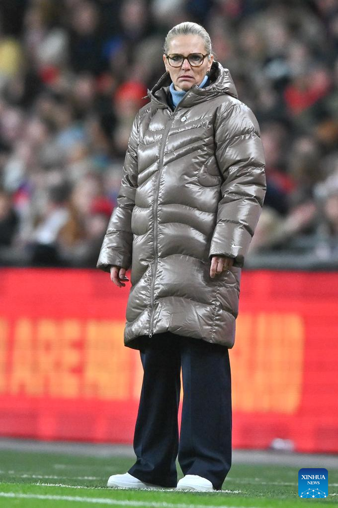 England's head coach Sarina Wiegman reacts during an international women's football friendly match between China and England at Wembley Stadium in London, Britain, Nov. 29, 2025. (Photo by Vince Mignott/Xinhua)