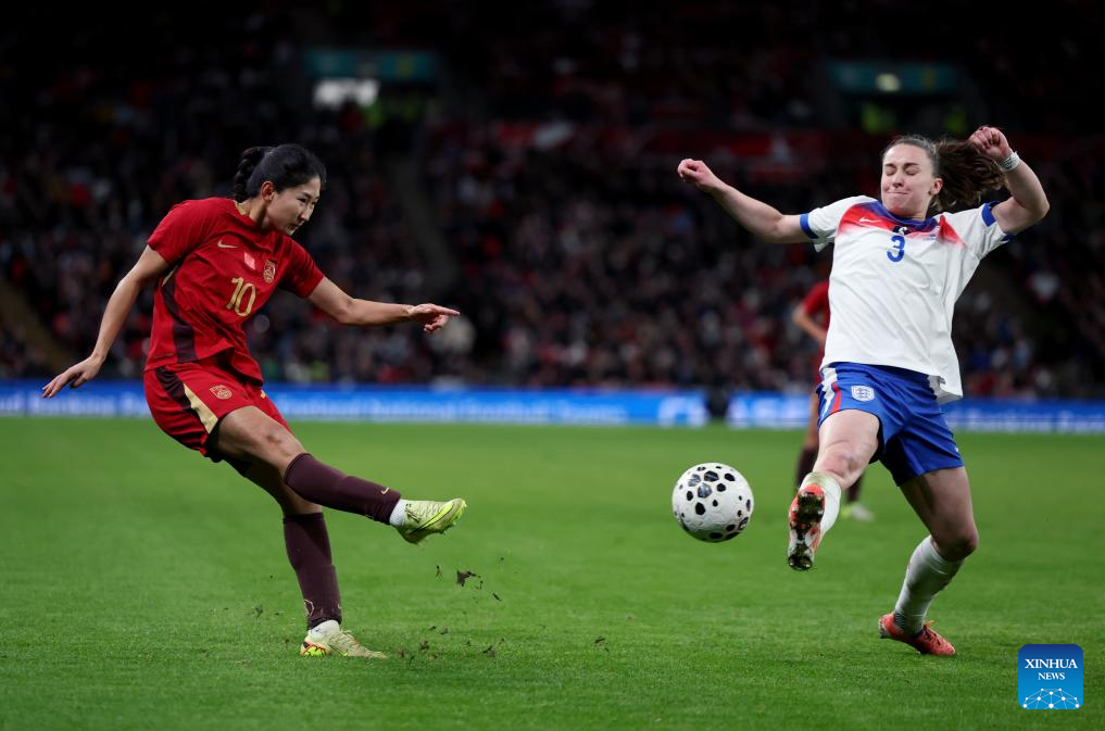 China's Shao Ziqin vies with England's Lucy Bronze (L) during an international women's football friendly match between China and England at Wembley Stadium in London, Britain, Nov. 29, 2025. (Xinhua/Li Ying)