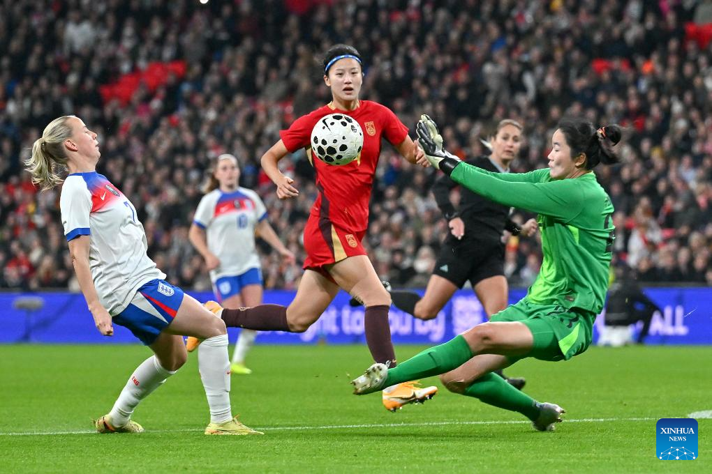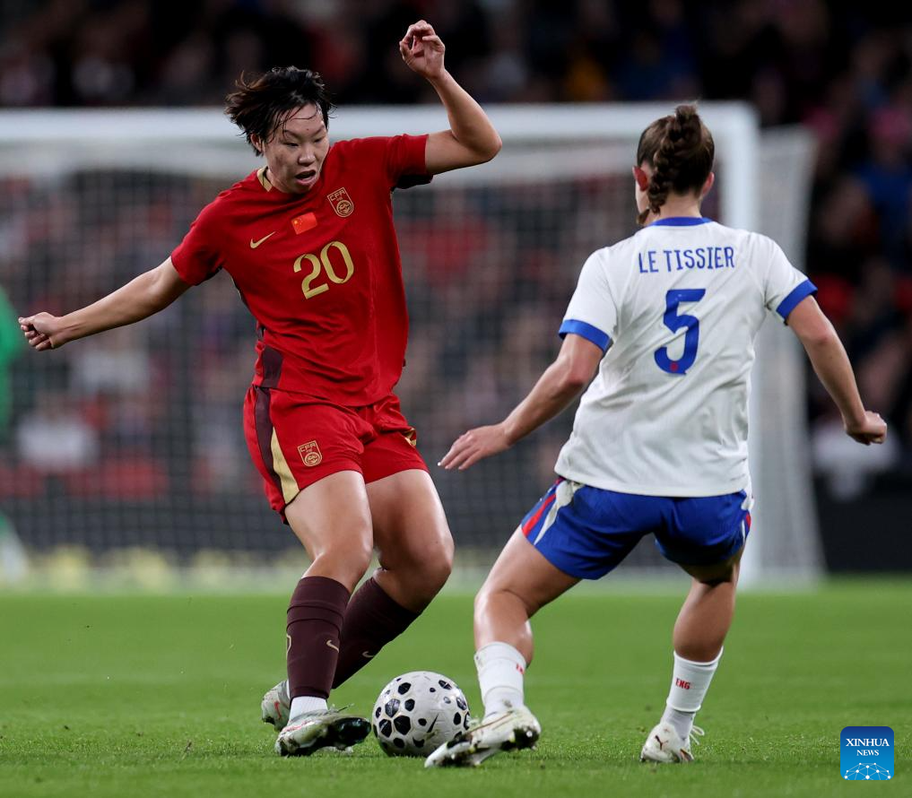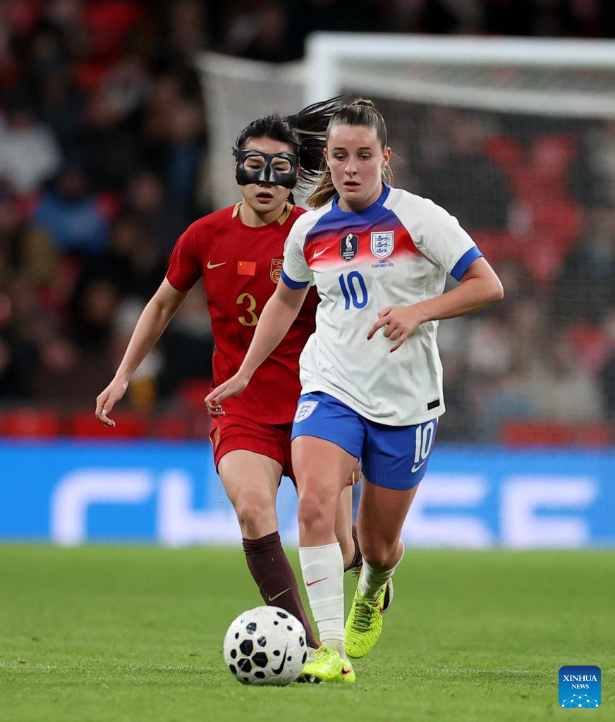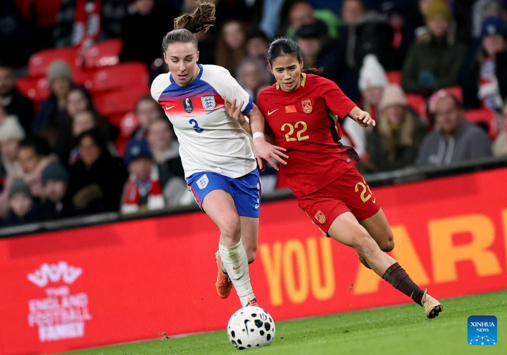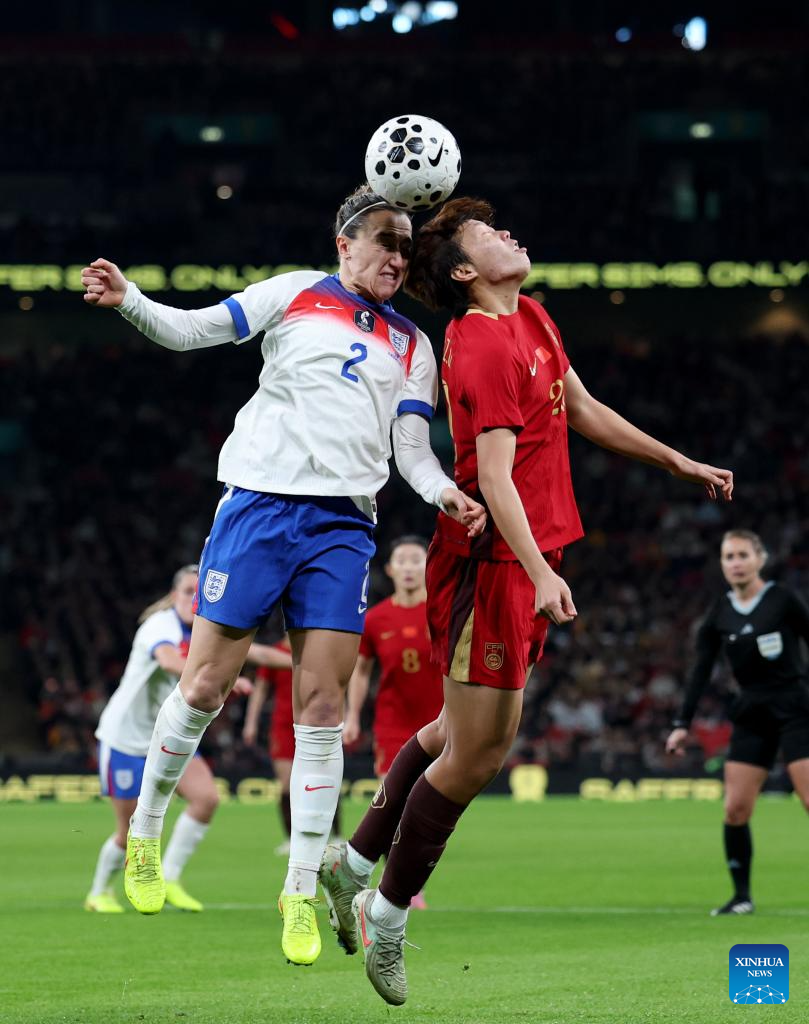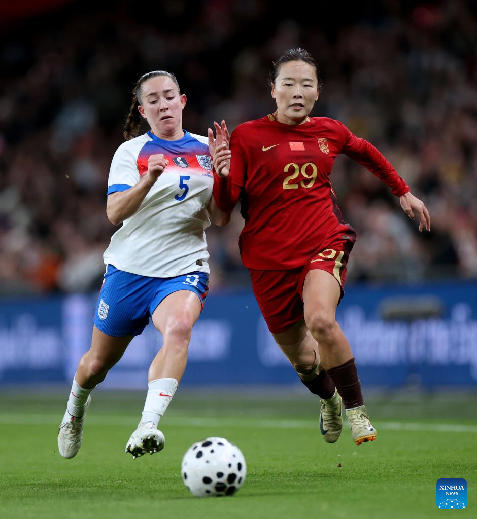 China's Dou Jiaxing (L) competes during an international women's football friendly match between China and England at Wembley Stadium in London, Britain, Nov. 29, 2025. (Xinhua/Li Ying)