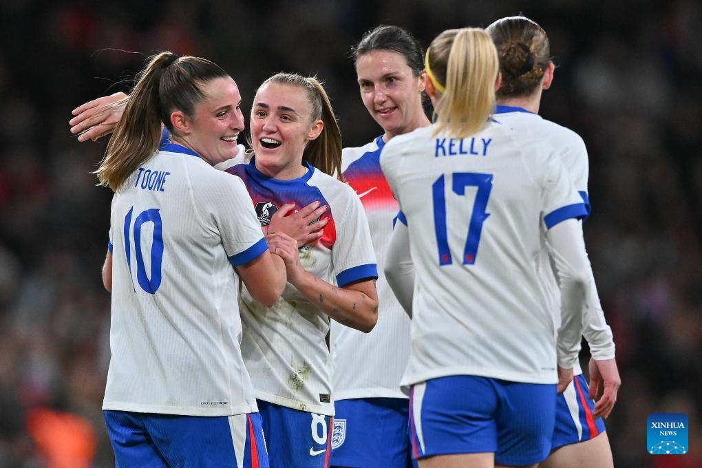 England's Ella Toone (1st L) celebrates scoring with teammates during an international women's football friendly match between China and England at Wembley Stadium in London, Britain, Nov. 29, 2025. (Photo by Vince Mignott/Xinhua)