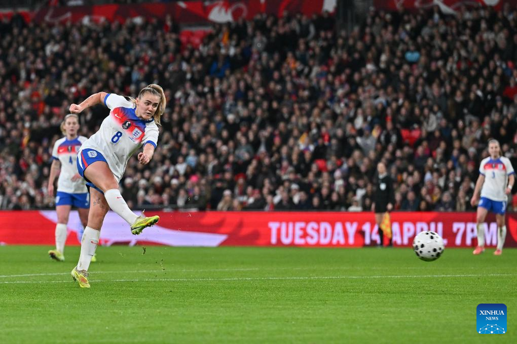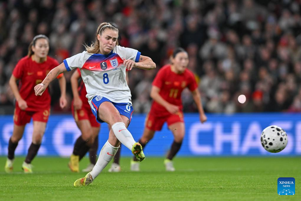 England's Georgia Stanway shoots and scores during an international women's football friendly match between China and England at Wembley Stadium in London, Britain, Nov. 29, 2025. (Photo by Vince Mignott/Xinhua)