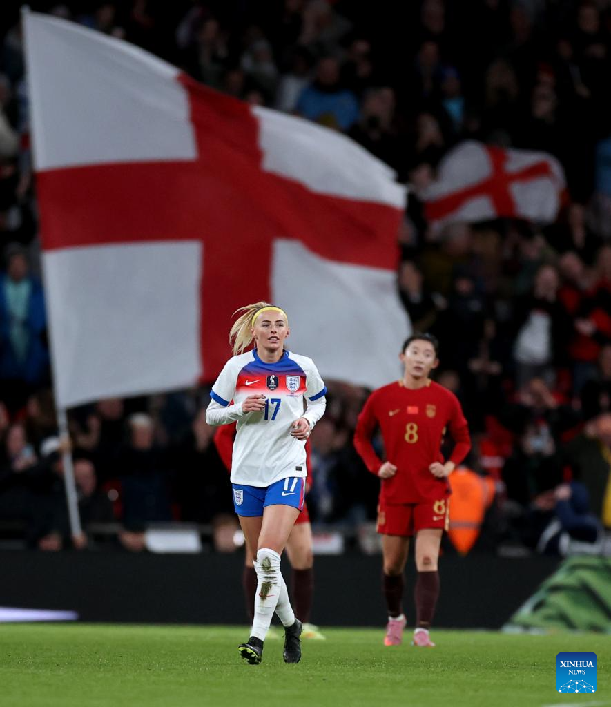 England's Beth Mead celebrates scoring during an international women's football friendly match between China and England at Wembley Stadium in London, Britain, Nov. 29, 2025. (Photo by Vince Mignott/Xinhua)