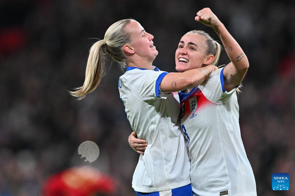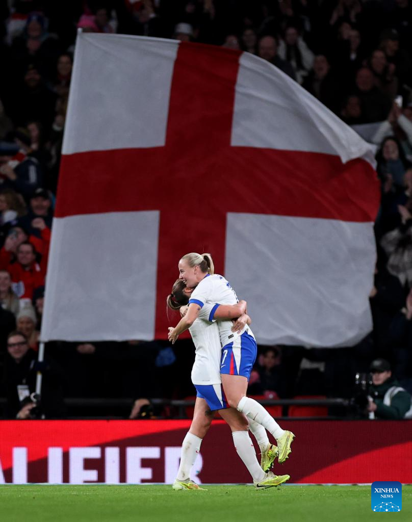 England's Georgia Stanway (R) celebrates scoring during an international women's football friendly match between China and England at Wembley Stadium in London, Britain, Nov. 29, 2025. (Photo by Vince Mignott/Xinhua)