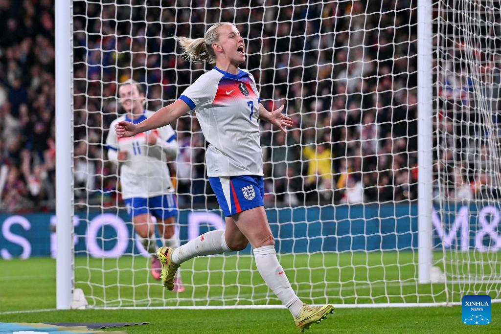 England's Chloe Kelly celebrates scoring during an international women's football friendly match between China and England at Wembley Stadium in London, Britain, Nov. 29, 2025. (Xinhua/Li Ying)