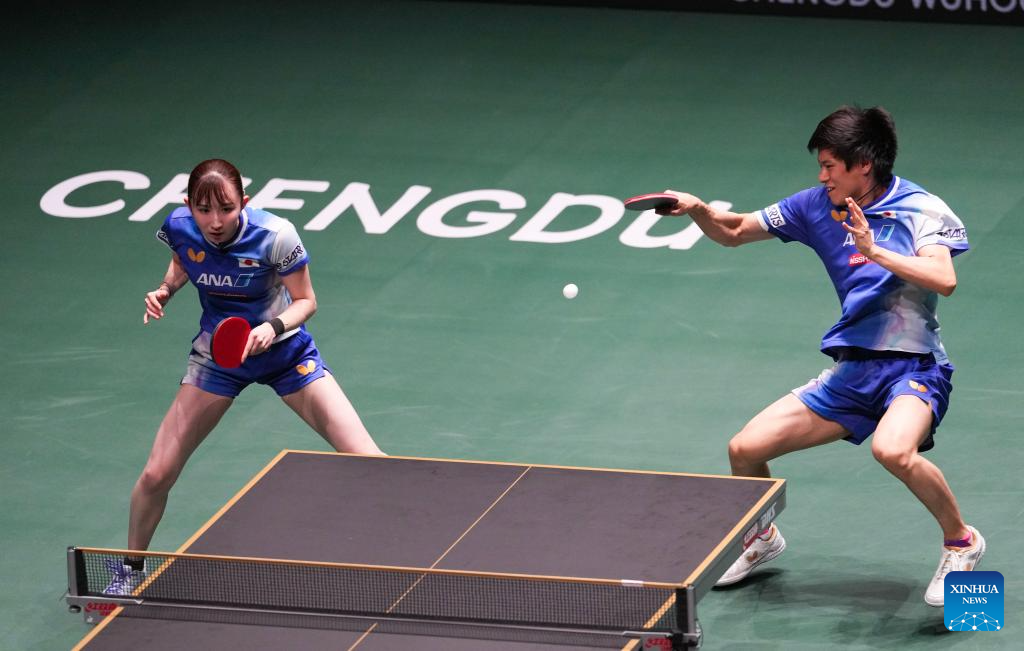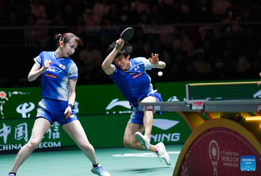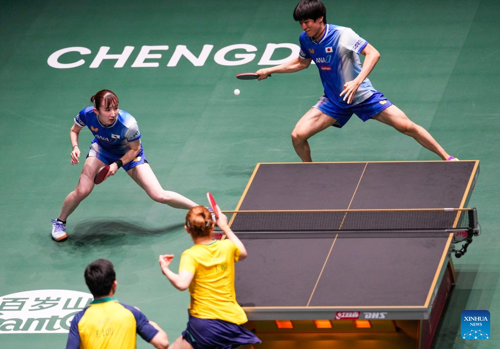Hayata Hina/Togami Shunsuke (R) of Japan compete during the mixed doubles match against Wu Jiamuwa/Luu Finn of Australia during the stage 1 group match between Japan and Australia at the ITTF Mixed Team World Cup 2025 in Chengdu, southwest China's Sichuan Province, Nov. 30, 2025. (Xinhua/Wang Ying)