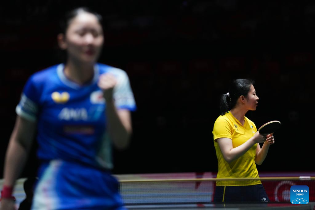 Liu Yangzi (R) of Australia reacts during the women's singles match against Harimoto Miwa of Japan during the stage 1 group match between Japan and Australia at the ITTF Mixed Team World Cup 2025 in Chengdu, southwest China's Sichuan Province, Nov. 30, 2025. (Xinhua/Wang Ying)