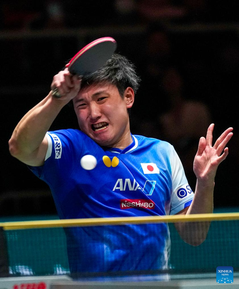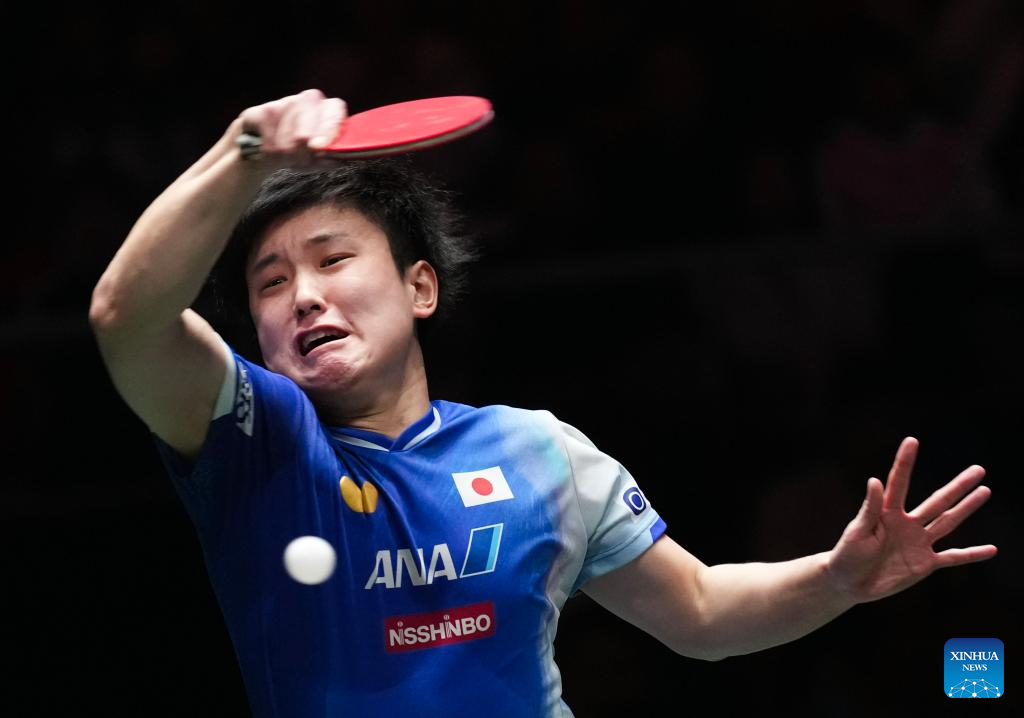 Harimoto Tomokazu of Japan hits a return during the men's singles match against Lum Nicholas of Australia during the stage 1 group match between Japan and Australia at the ITTF Mixed Team World Cup 2025 in Chengdu, southwest China's Sichuan Province, Nov. 30, 2025. (Xinhua/Wang Ying)