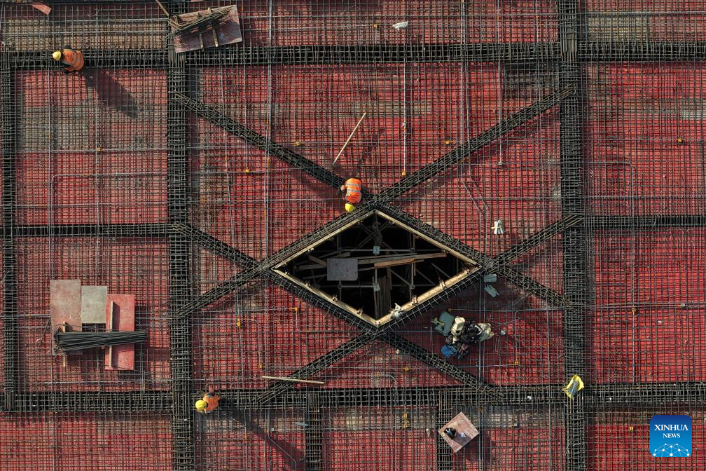 An aerial drone photo taken on Nov. 30, 2025 shows laborers working at the construction site of a square in front of Huaibei West Railway Station in Huaibei, east China's Anhui Province. The Huaibei West Railway Station is along an intercity railway stretching about 161 kilometers which will link the cities of Huaibei, Suzhou and Bengbu in Anhui Province. (Xinhua/Huang Bohan)