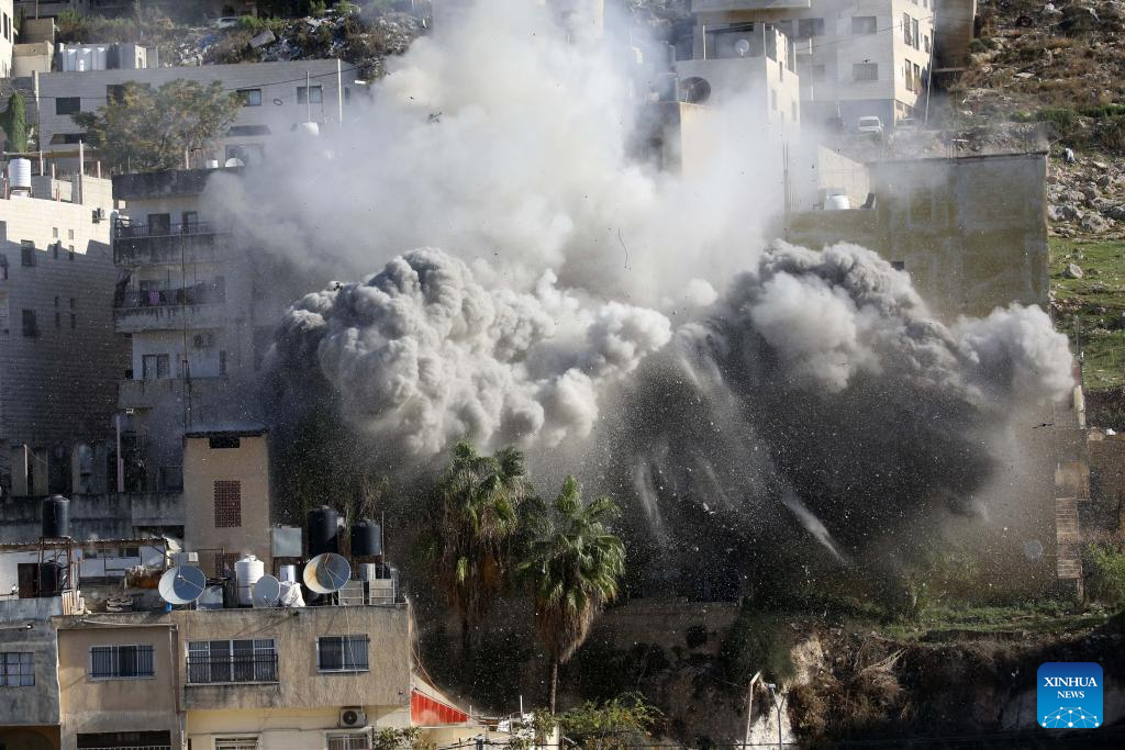 Smoke rises as Israeli forces blow up a Palestinian house in the West Bank city of Nablus, Dec. 2, 2025. (Photo by Nidal Eshtayeh/Xinhua)
