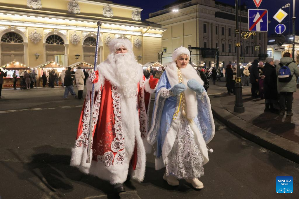 People dressed up as Father Frost and Snow Maiden walk through a Christmas market in St. Petersburg, Russia, Dec. 13, 2025. A Christmas market opened here on Saturday for the upcoming Christmas and New Year holidays. (Photo by Irina Motina/Xinhua)