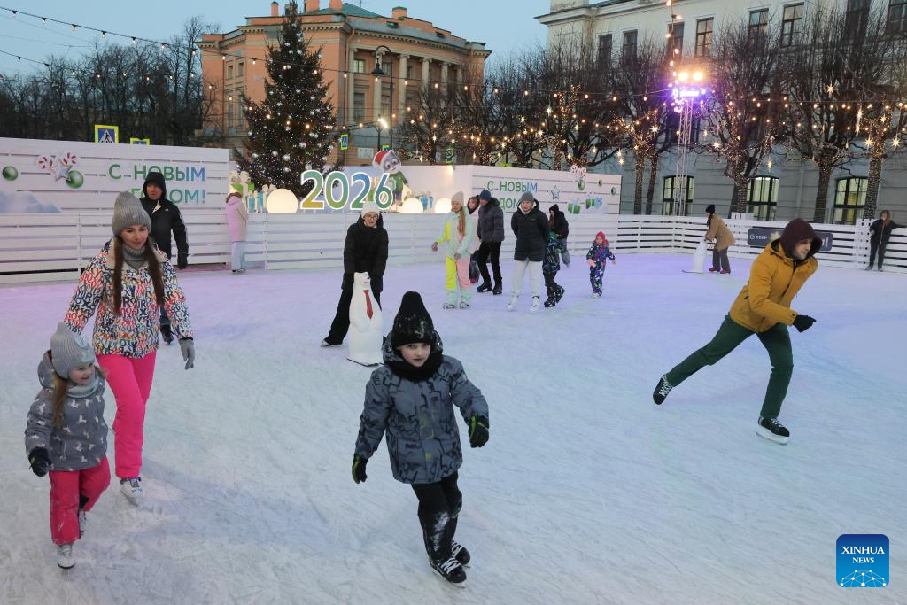 People skate on an ice rink at a Christmas market in St. Petersburg, Russia, Dec. 13, 2025. A Christmas market opened here on Saturday for the upcoming Christmas and New Year holidays. (Photo by Irina Motina/Xinhua)