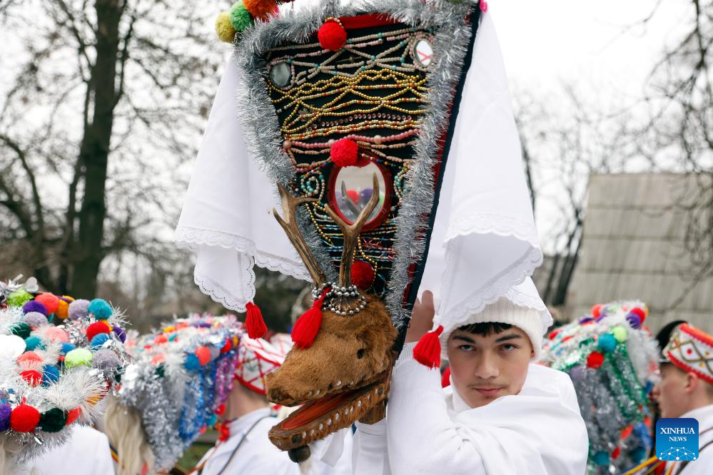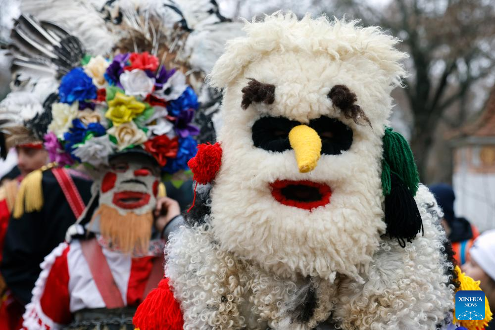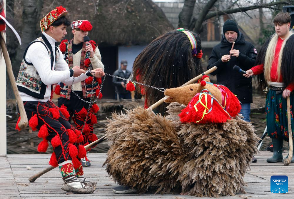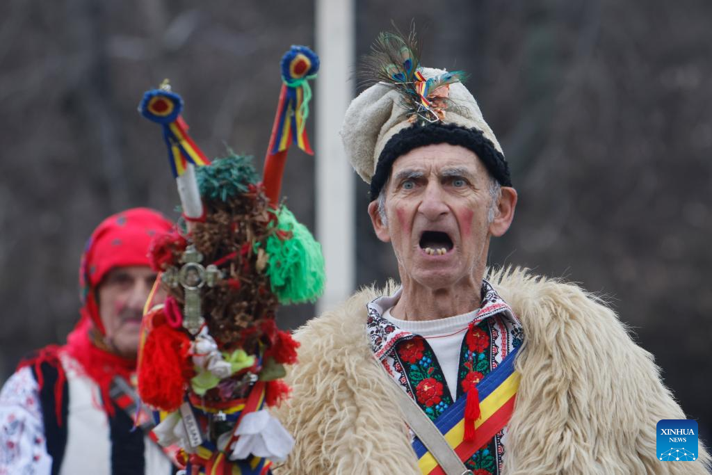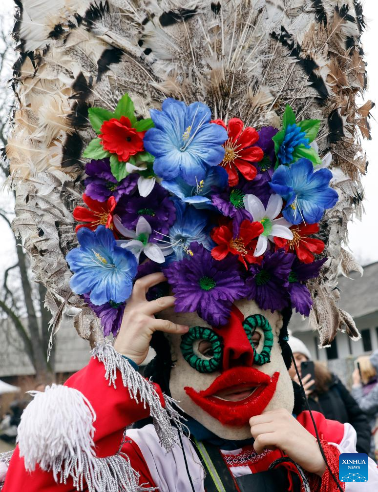 A masked member of a traditional dance group performs during the "White Flowers" festival of traditions and customs at the Village Museum in Bucharest, Romania, on Dec. 14, 2025. (Photo by Cristian Cristel/Xinhua)