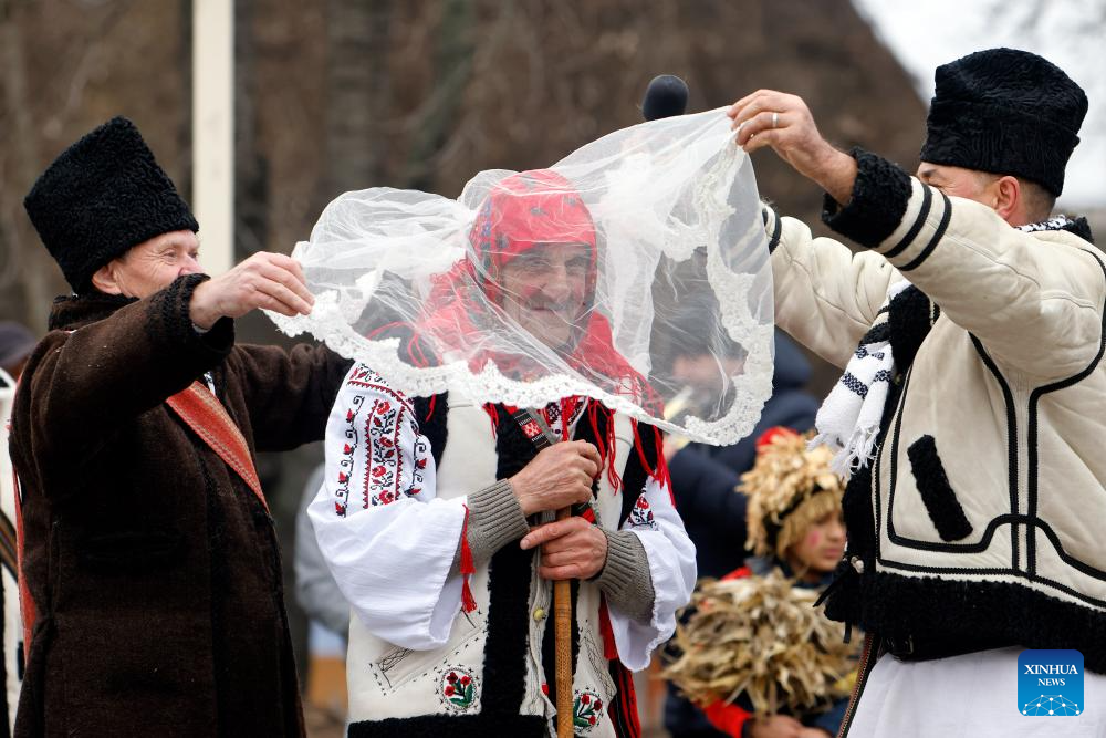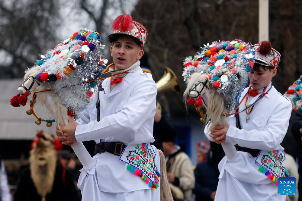 A member of a traditional dance group participates in a parade during the "White Flowers" festival of traditions and customs at the Village Museum in Bucharest, Romania, on Dec. 14, 2025. (Photo by Cristian Cristel/Xinhua)