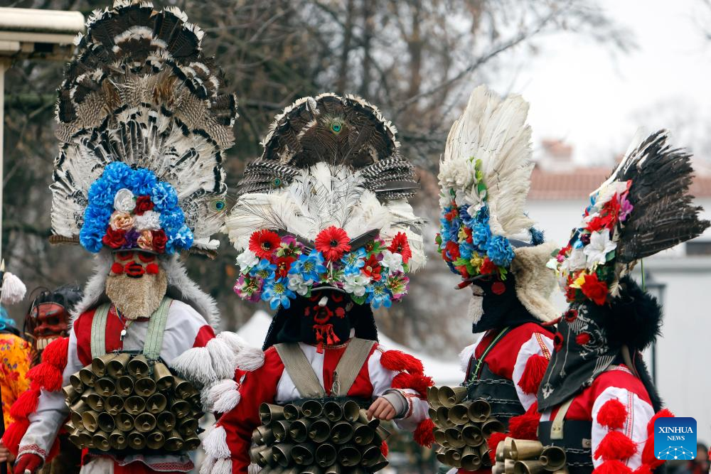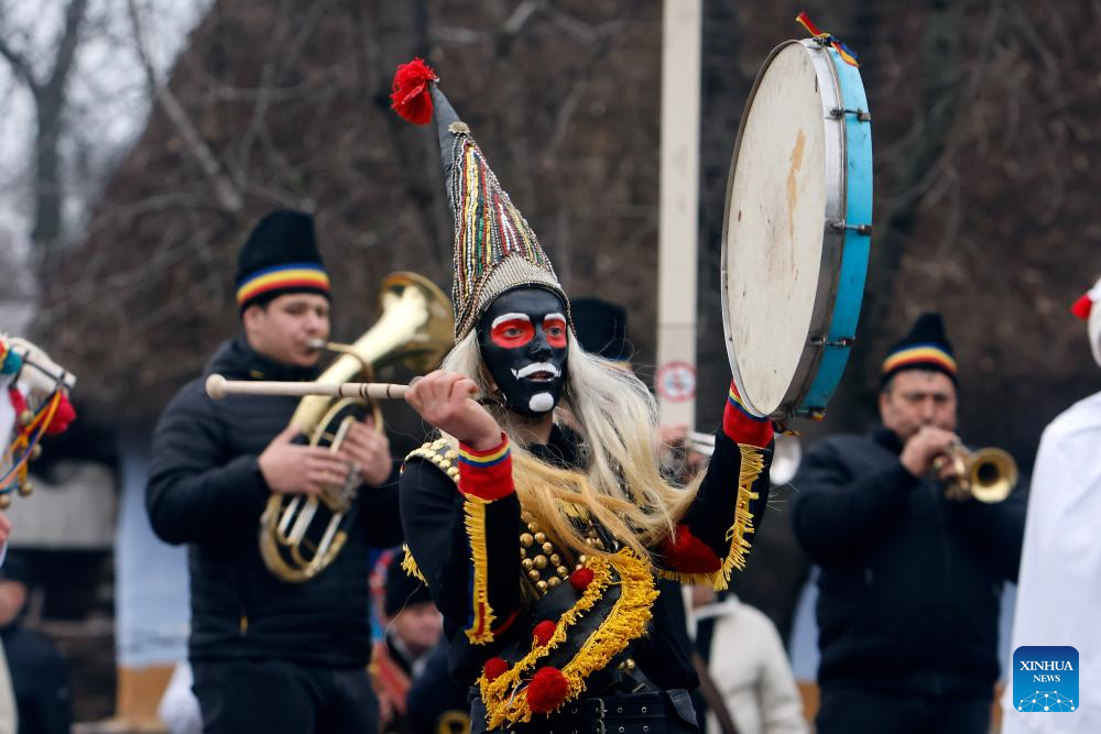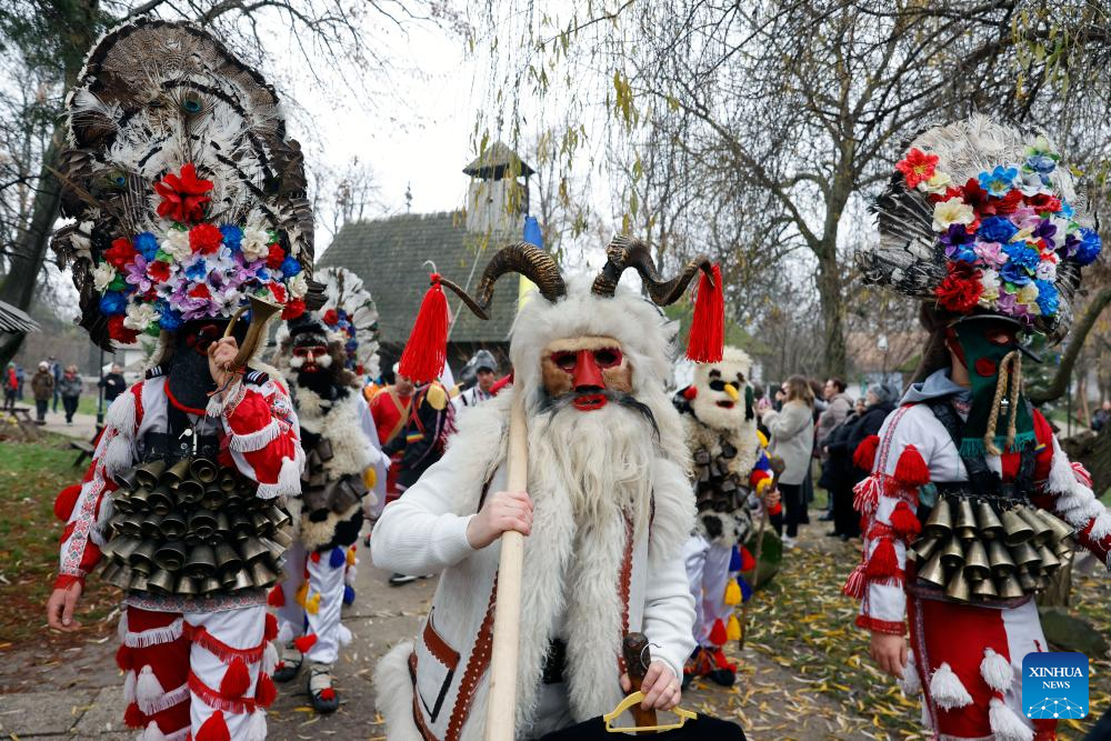 Masked members of a traditional dance group participate in a parade during the "White Flowers" festival of traditions and customs at the Village Museum in Bucharest, Romania, on Dec. 14, 2025. (Photo by Cristian Cristel/Xinhua)