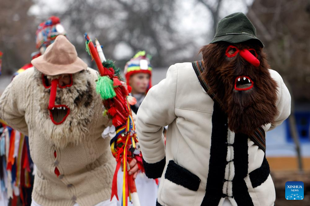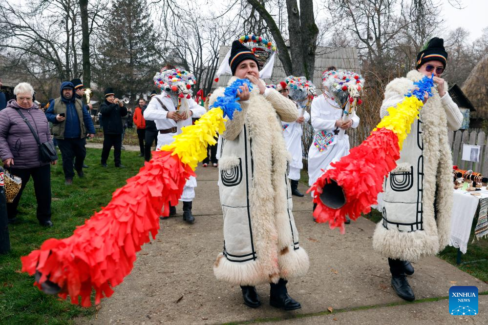 Masked members of a traditional dance group perform during the "White Flowers" festival of traditions and customs at the Village Museum in Bucharest, Romania, on Dec. 14, 2025. (Photo by Cristian Cristel/Xinhua)