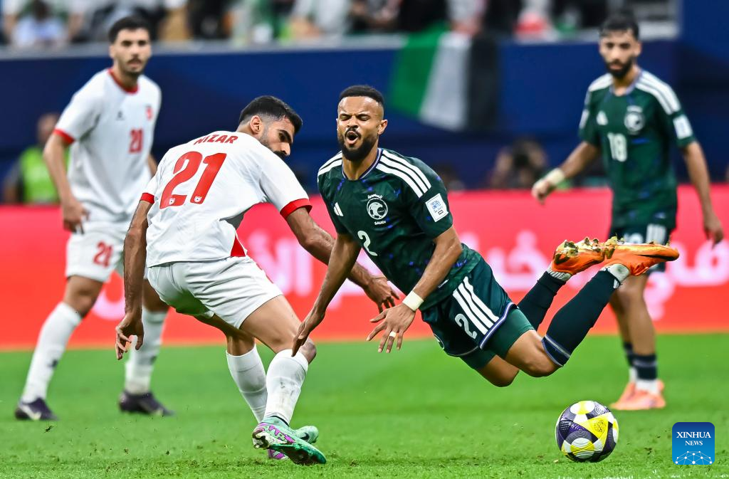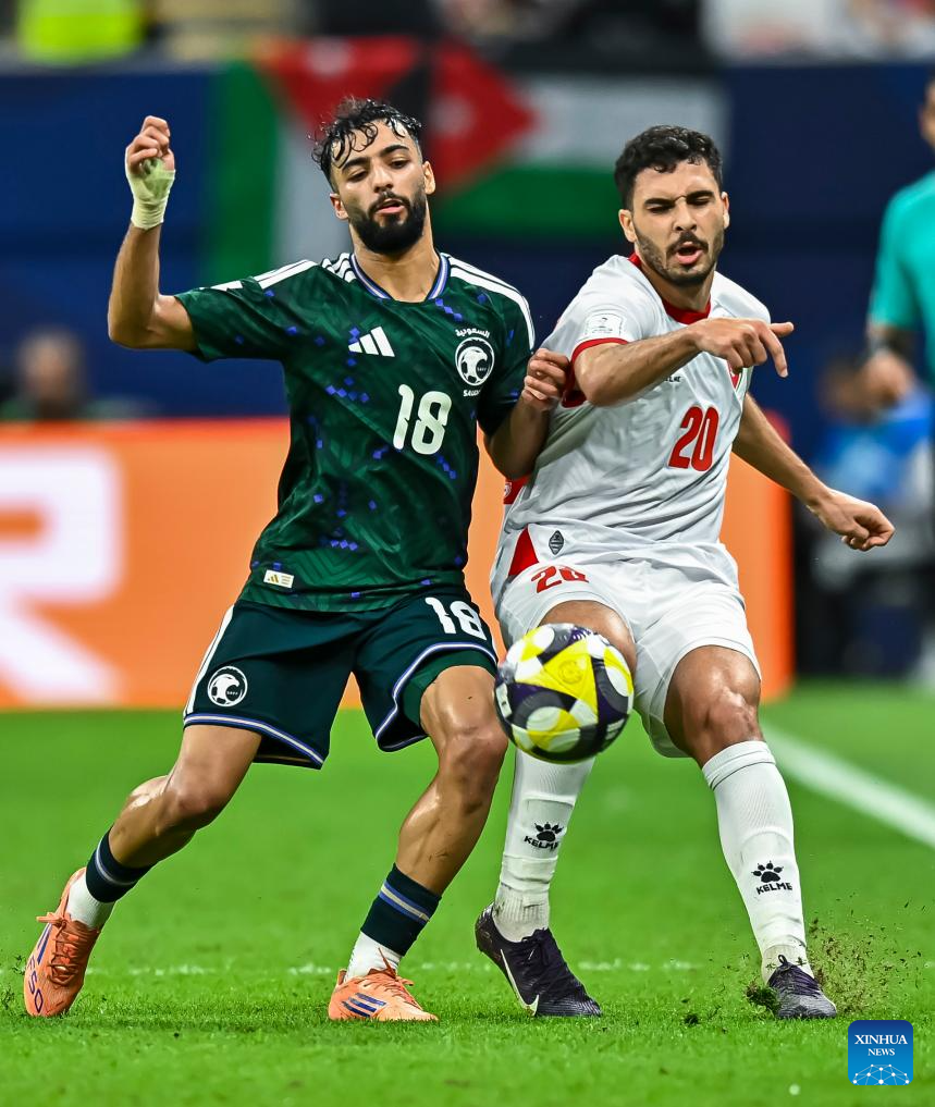 Hassan Altambakti (R) of Saudi Arabia vies with Mahmoud Almardi (C) of Jordan during the FIFA Arab Cup 2025 Semi-final match between Saudi Arabia and Jordan at Al Bayt Stadium in Al Khor, Qatar, on Dec. 15, 2025. (Photo by Nikku/Xinhua)