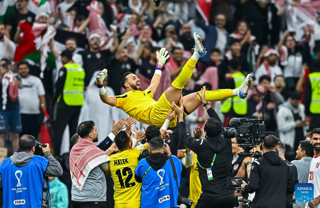 Jordan's team members celebrate with goalkeeper Yazeed Abulaila (top) the FIFA Arab Cup 2025 Semi-final match between Saudi Arabia and Jordan at Al Bayt Stadium in Al Khor, Qatar, on Dec. 15, 2025. (Photo by Nikku/Xinhua)