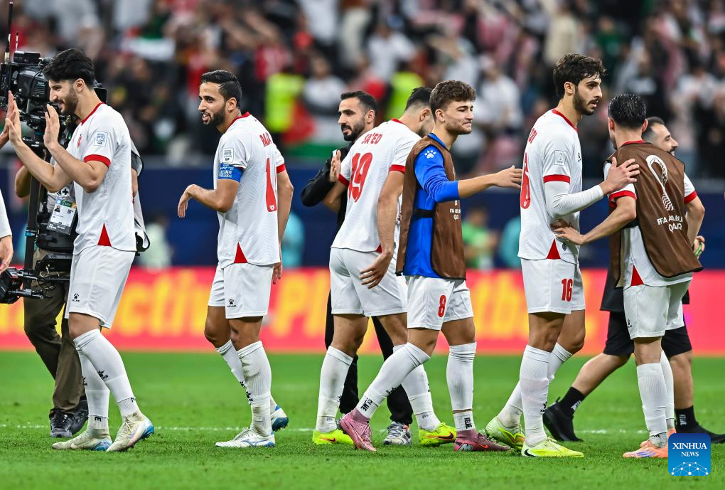 Players of Jordan celebrate after the FIFA Arab Cup 2025 Semi-final match between Saudi Arabia and Jordan at Al Bayt Stadium in Al Khor, Qatar, on Dec. 15, 2025. (Photo by Nikku/Xinhua)