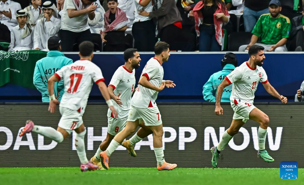 Players of Jordan celebrate after winning the FIFA Arab Cup 2025 Semi-final match between Saudi Arabia and Jordan at Al Bayt Stadium in Al Khor, Qatar, on Dec. 15, 2025. (Photo by Nikku/Xinhua)
