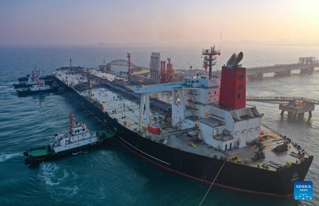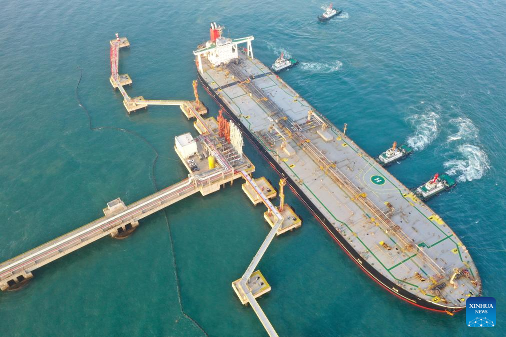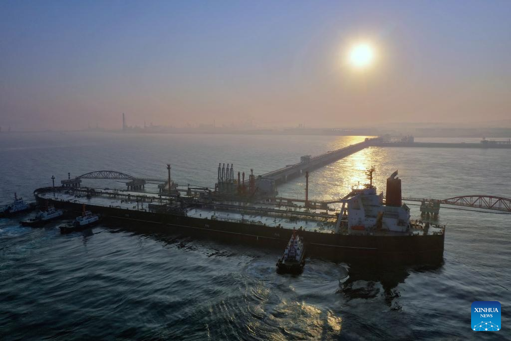 A drone photo shows a vessel carrying 179,000 tonnes of petrochemical raw materials berthing at Yangpu Port in Danzhou, south China's Hainan Province, Dec. 18, 2025. China on Thursday launched island-wide special customs operations in the Hainan Free Trade Port (FTP).