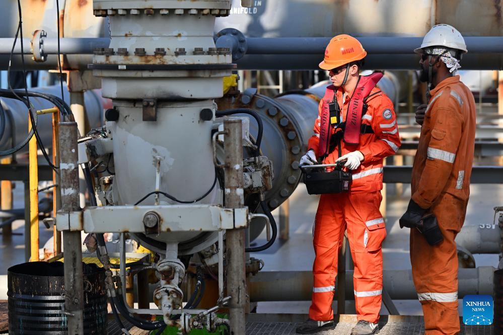 A port worker from China (L) and a foreign crew member work after a vessel carrying petrochemical raw materials has arrived at Yangpu Port in Danzhou, south China's Hainan Province, Dec. 18, 2025. China on Thursday launched island-wide special customs operations in the Hainan Free Trade Port (FTP).