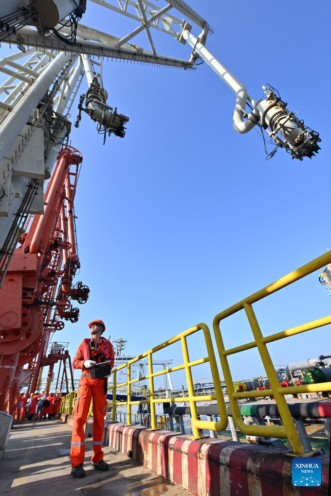 A staff member works after a vessel carrying petrochemical raw materials has arrived at Yangpu Port in Danzhou, south China's Hainan Province, Dec. 18, 2025. China on Thursday launched island-wide special customs operations in the Hainan Free Trade Port (FTP).